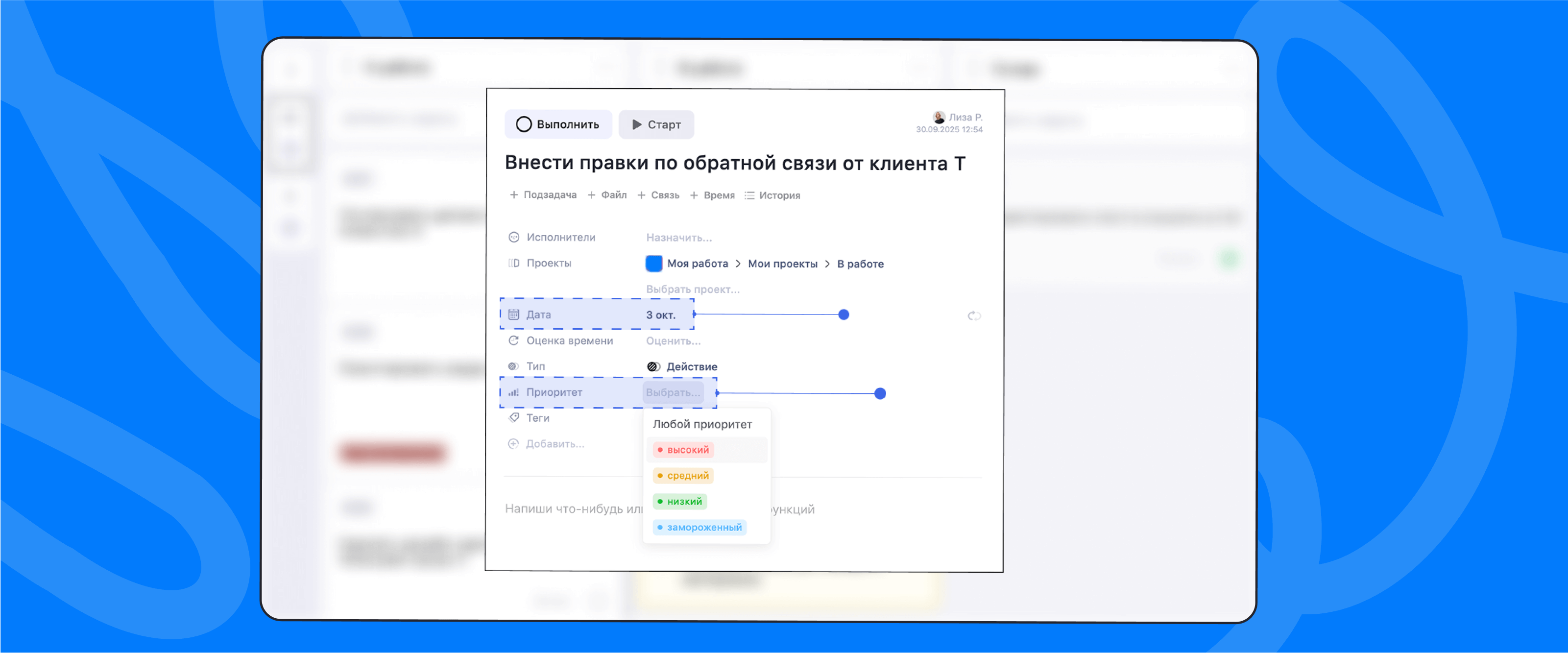 Чтобы сделать пространство удобнее, каждой задаче можно поставить цветовой приоритет, установить дату (дедлайн) и добавить теги.