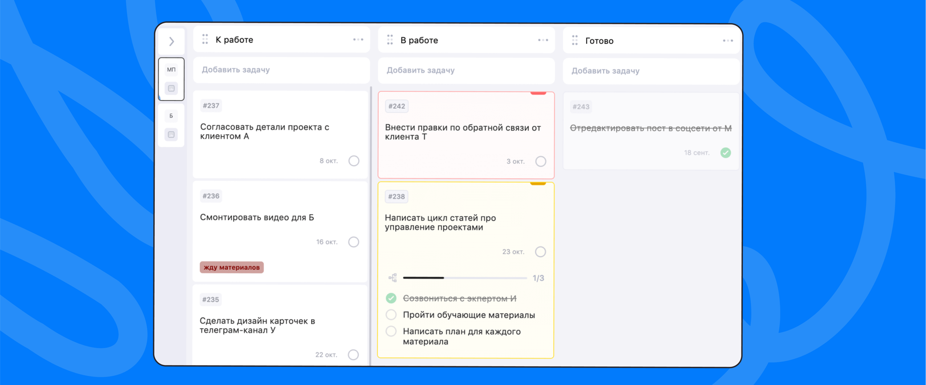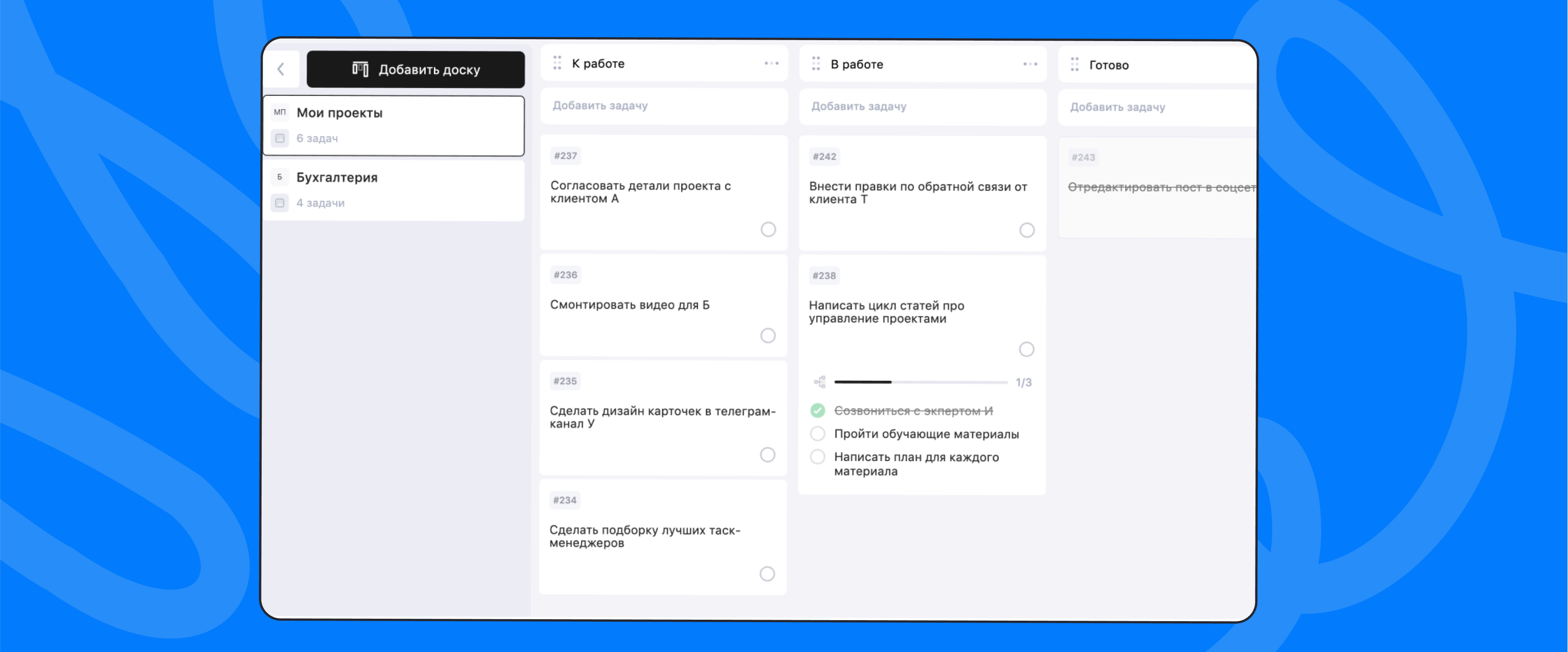 Каждый процесс на доске разбивается на этапы-колонки. По умолчанию это «К работе», «В работе» и «Готово» — по необходимости их можно переименовать. Добавьте свои задачи и перемещайте их по колонкам, как стикеры на физической доске.