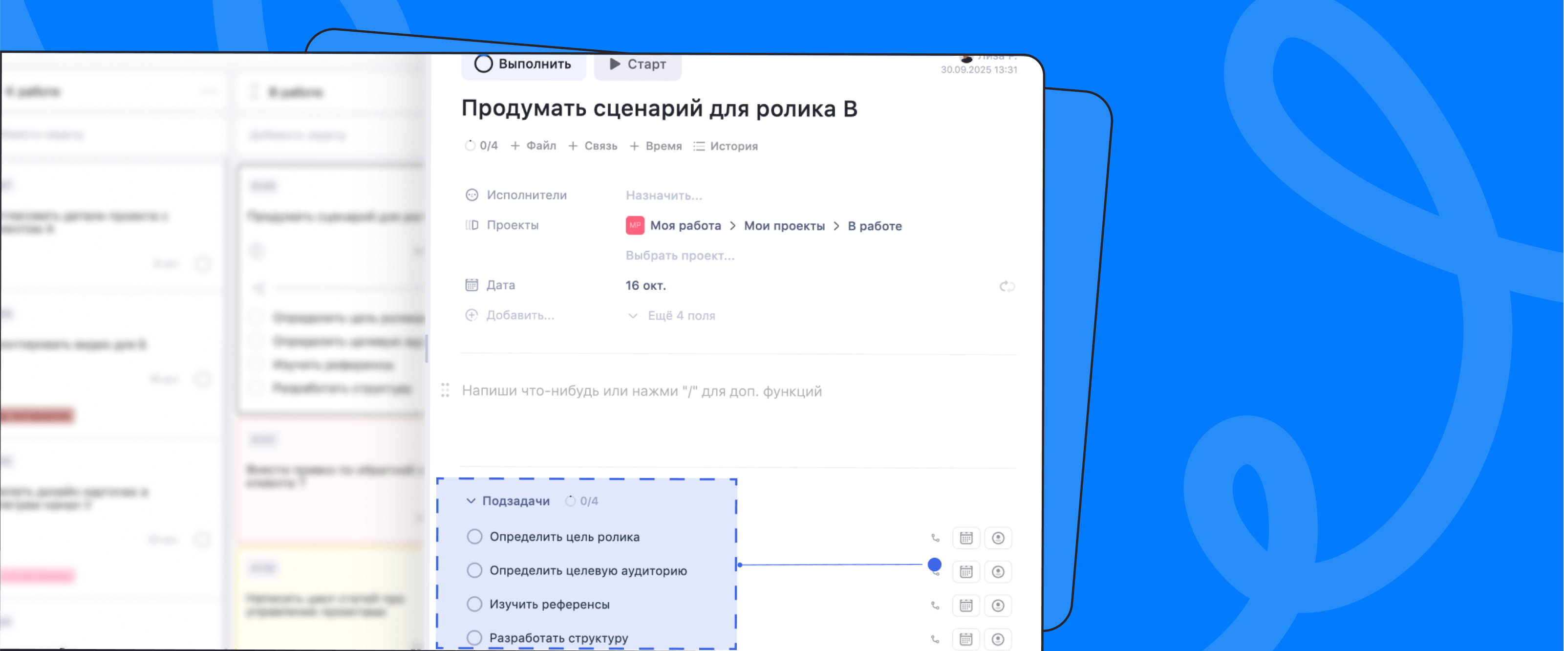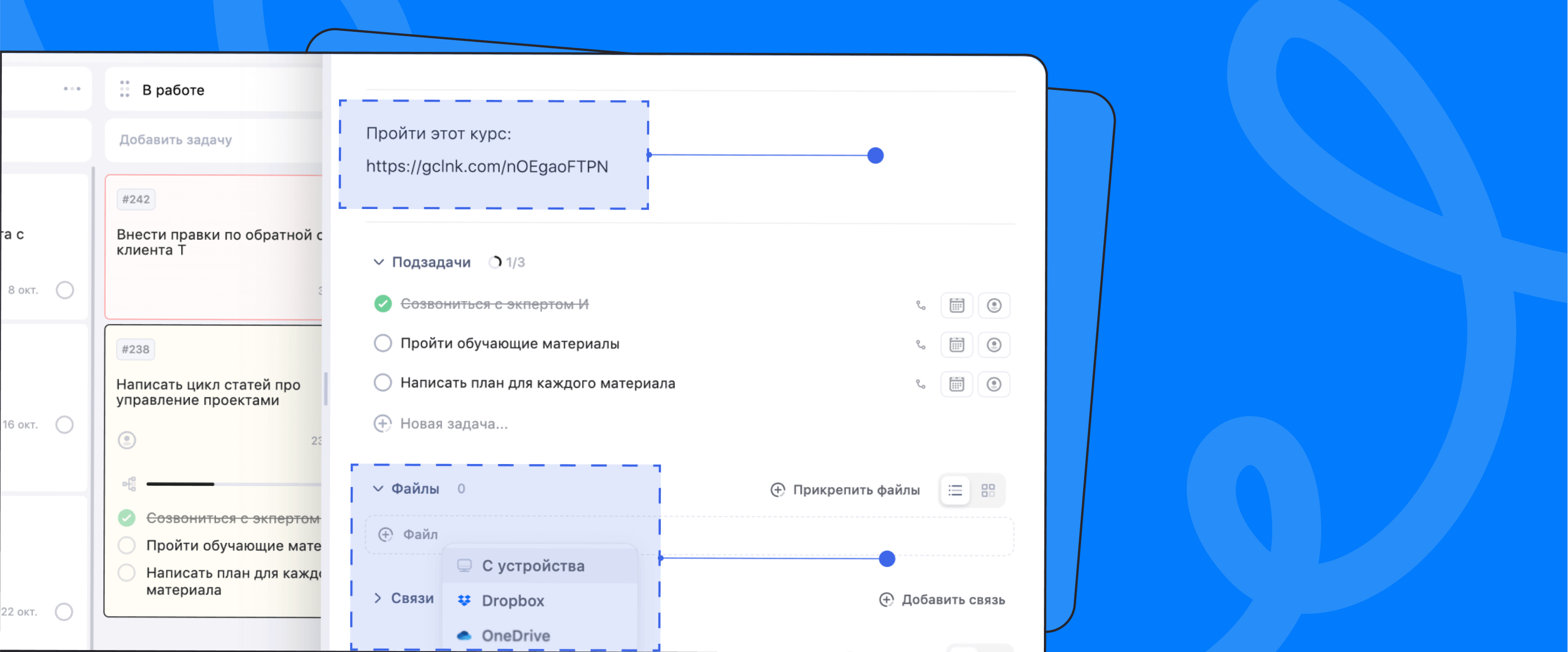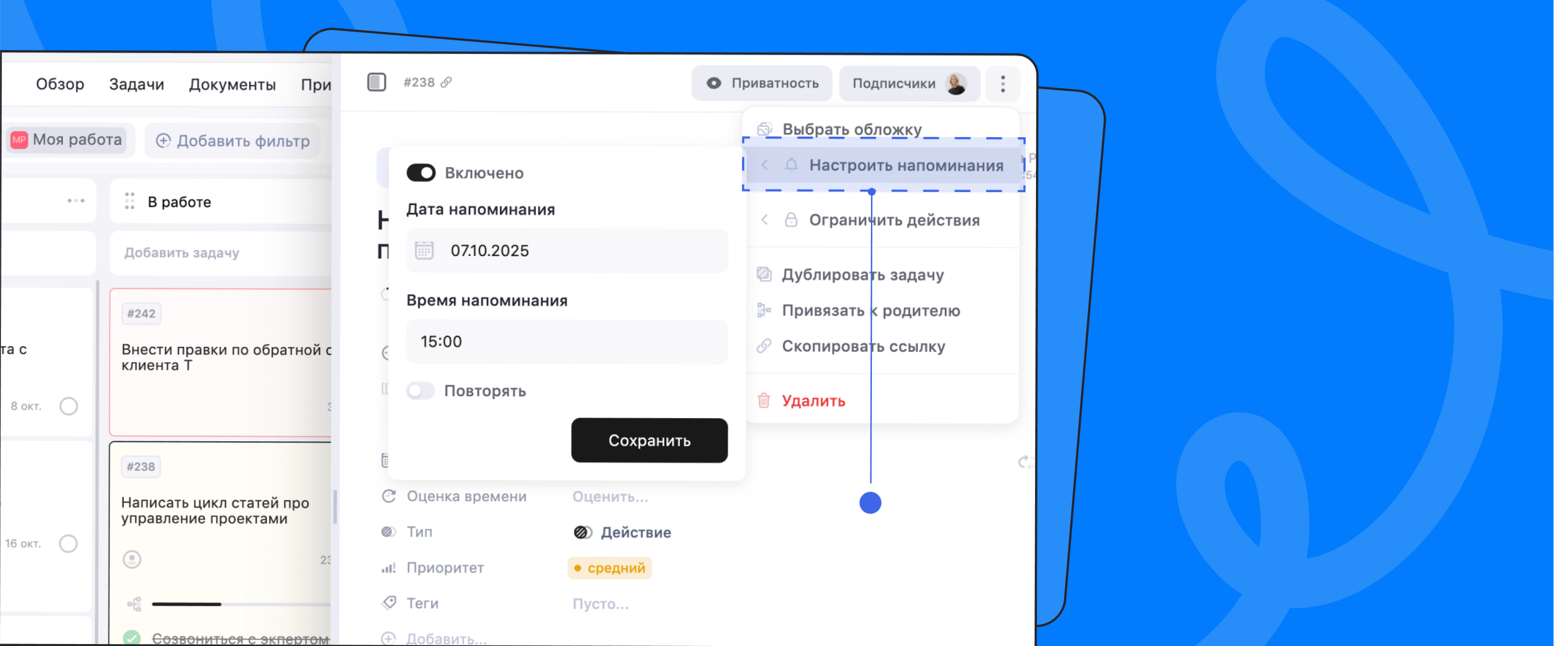 Внутри карточки задачи прикрепляйте документы, оставляйте важные заметки или устанавливайте напоминания о задаче, чтобы в нужный момент получить уведомление.