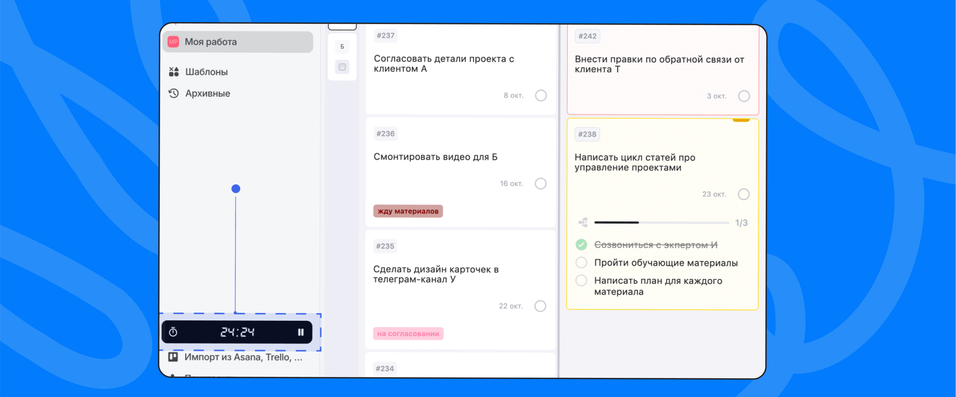 В общем, для самозанятого Канбан универсальный инструмент: он заменяет планировщик, напоминалку и даже систему приоритетов. А главный плюс в его простоте: достаточно трёх колонок и привычки перемещать карточки, чтобы почувствовать, что работа стала управляемой.