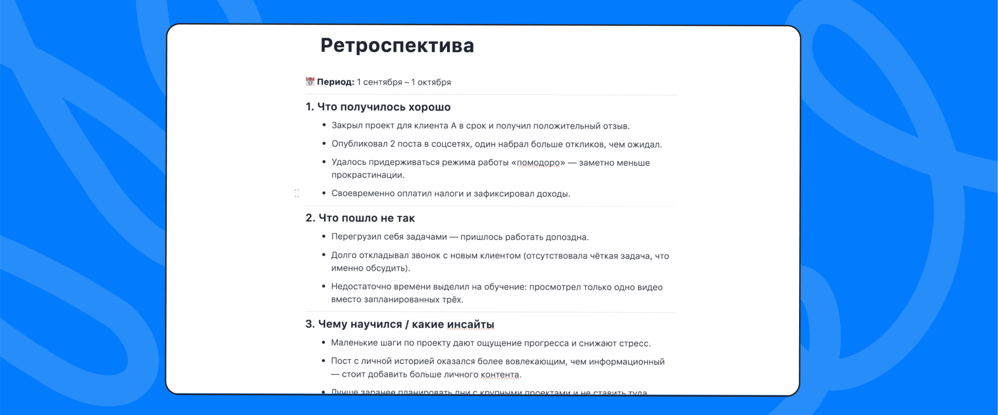 Ретроспектива — метод, пришедший из Agile. Это привычка регулярно оглядываться назад и смотреть, как идут дела. Пригодится, чтобы замечать успехи, находить ошибки и делать выводы.