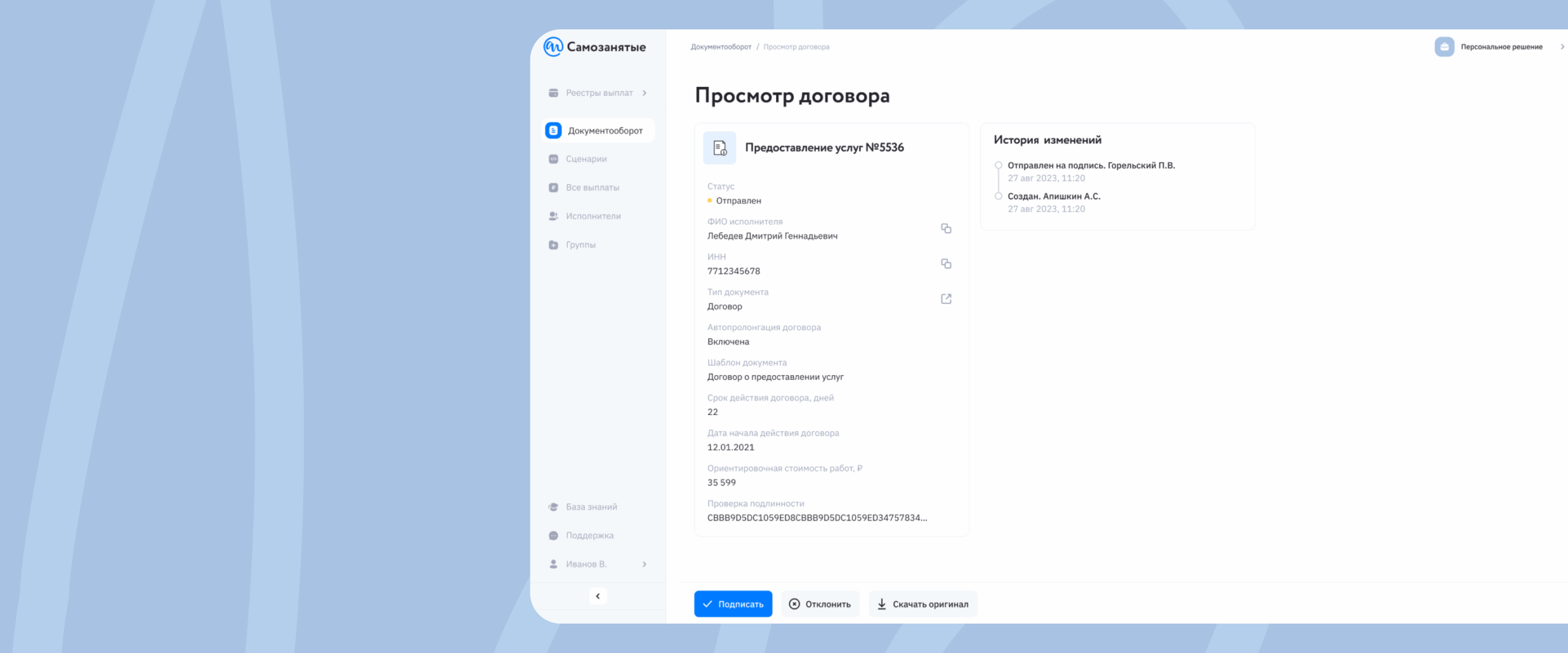 Сервисы для работы с внештатным персоналом собирают данные ваших исполнителей, предоставляют шаблоны безрисковых договоров или загружают в кабинет ваши. Как правило, документы подписывают с помощью ПЭП. Это удобно: исполнитель получает ссылку, вводит код из смс и договор или акт считается подписанным. Оригиналы хранятся на платформе и компания может в любой момент скачать архив по нужному периоду или исполнителю.