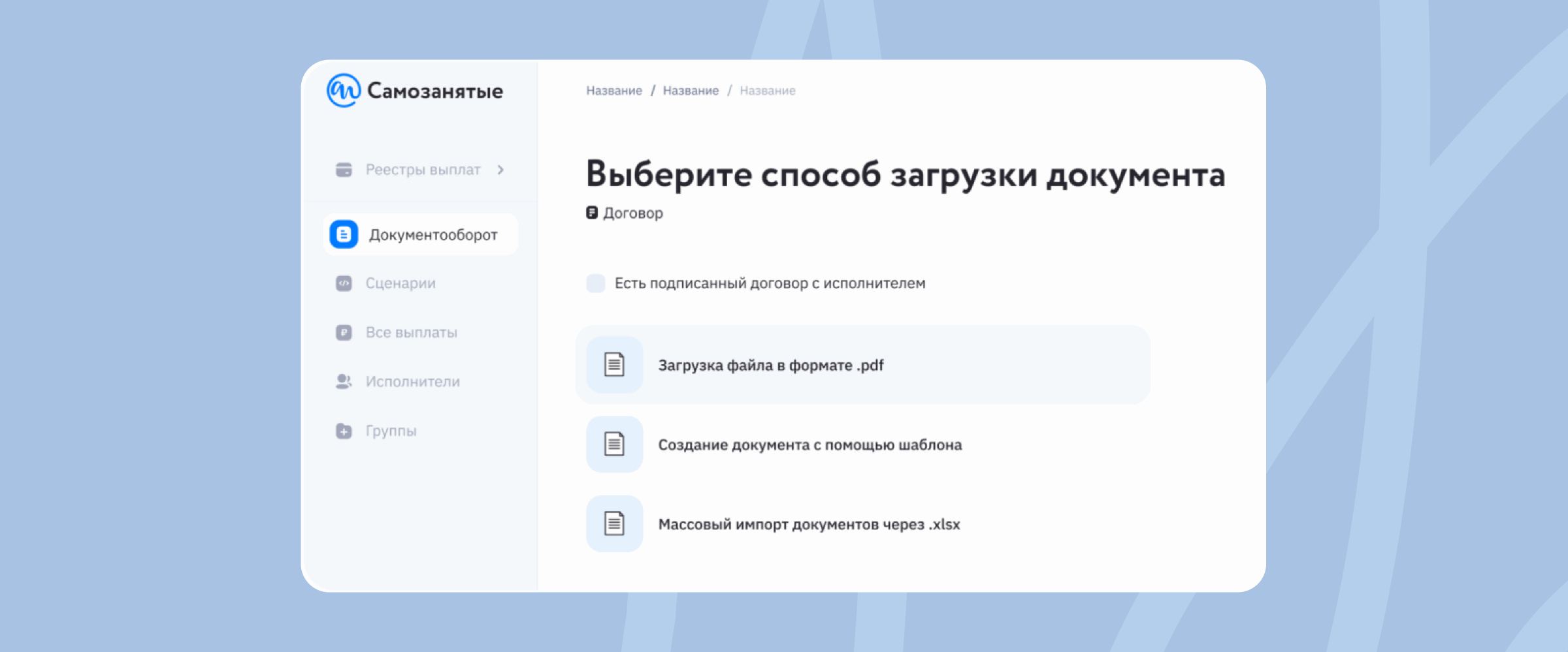 В сервис можно загрузить договор, дополнительное соглашение или любой другой документ, если у компании есть специфические требования или согласованная юристами форма.