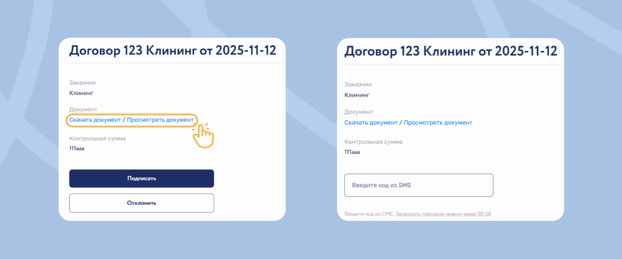 - Исполнитель открывает документ в своем личном кабинете, нажимает «Подписать» и тоже вводит код из СМС — это и есть ПЭП.