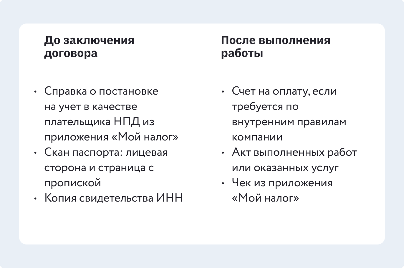 Перед подписанием договора запросите у самозанятого справку о постановке на учет в качестве налогоплательщика НПД (можно скачать в приложении «Мой налог»). Или быстрее — статус через сервис, указав ИНН. Убедитесь, что самозанятый не был сотрудником вашей или дочерней компании последние два года.