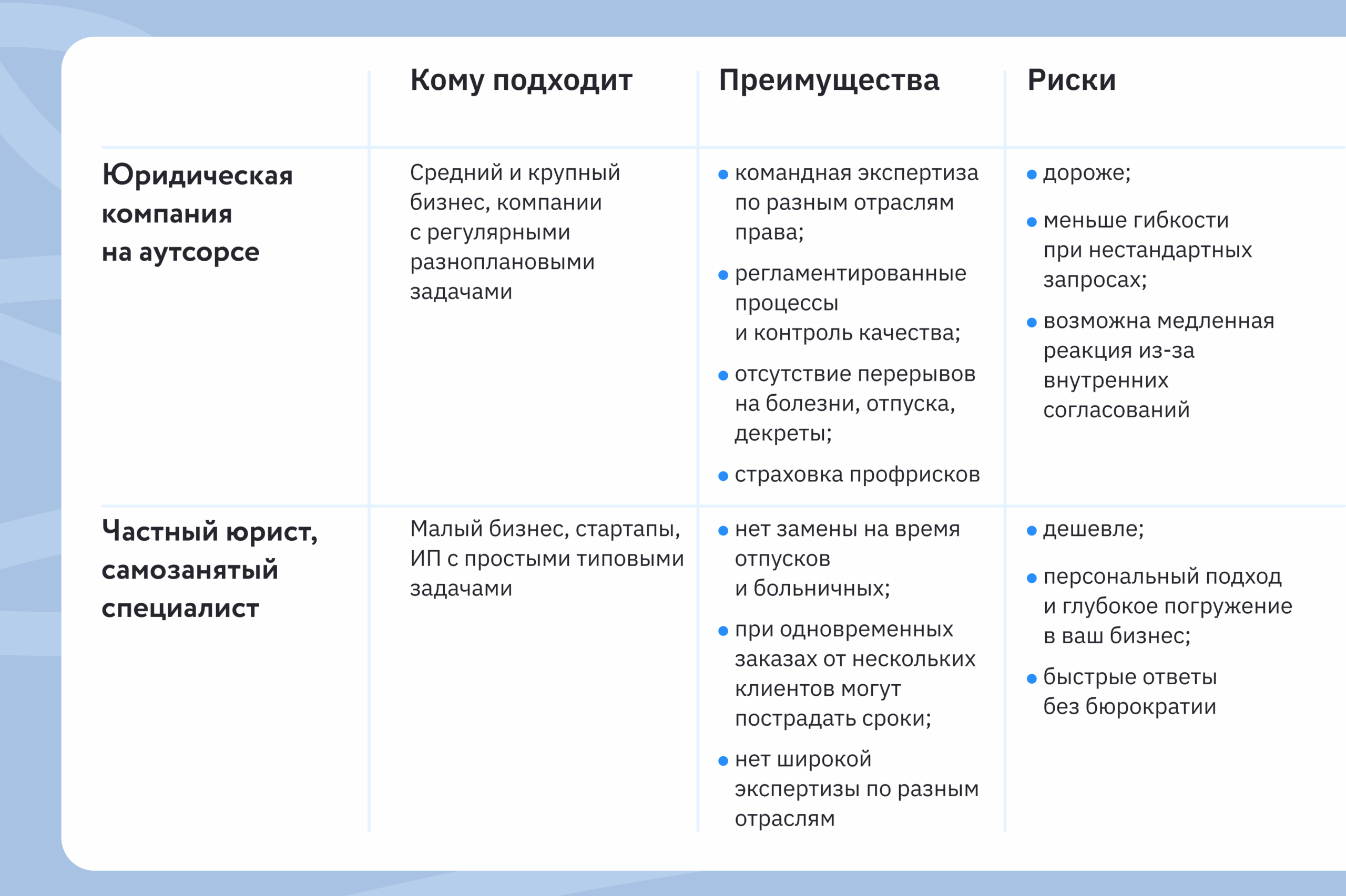 Юридический аутсорс пригодится, когда загрузки для штатного юриста недостаточно, а задачи есть. Например: