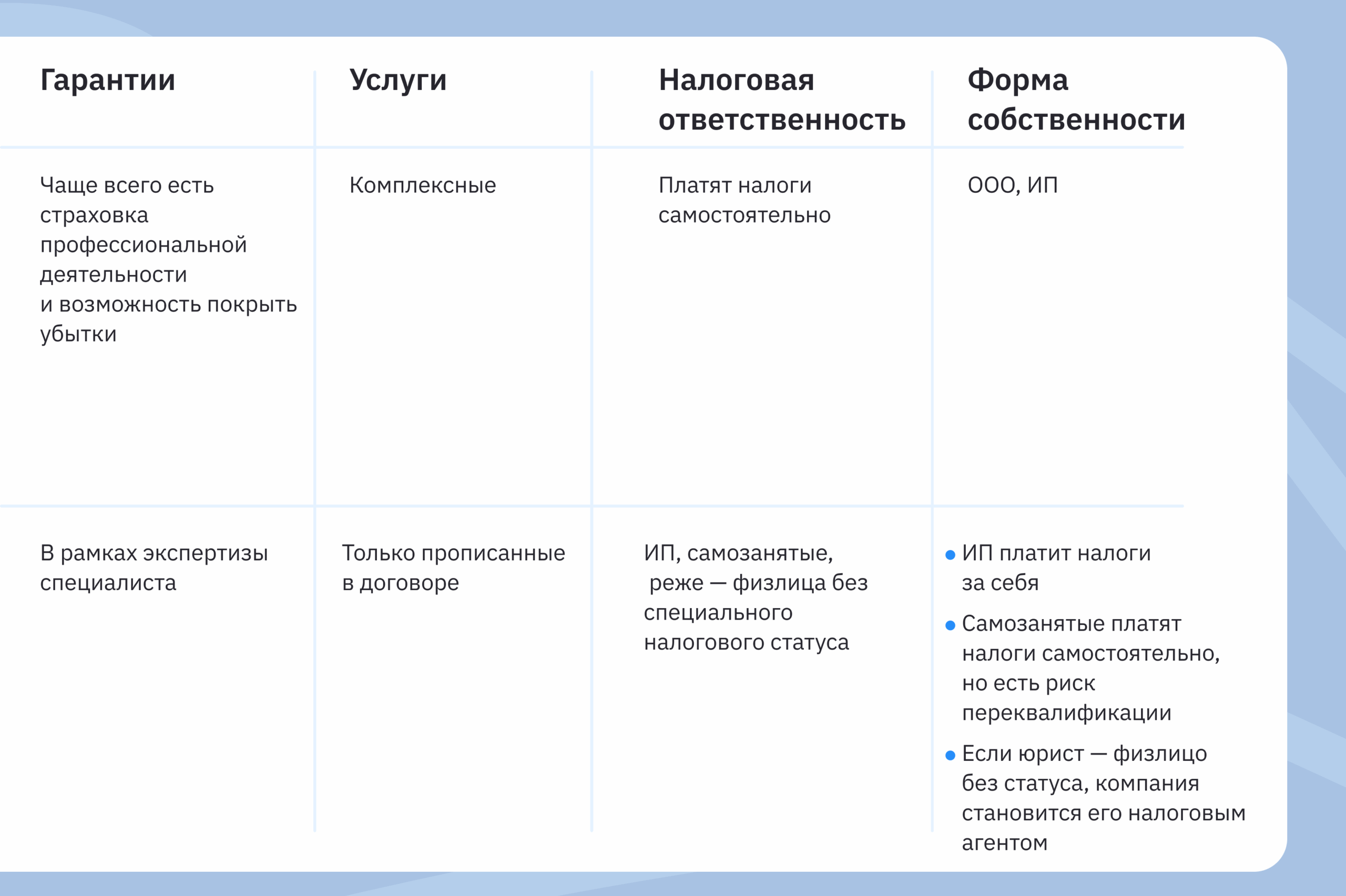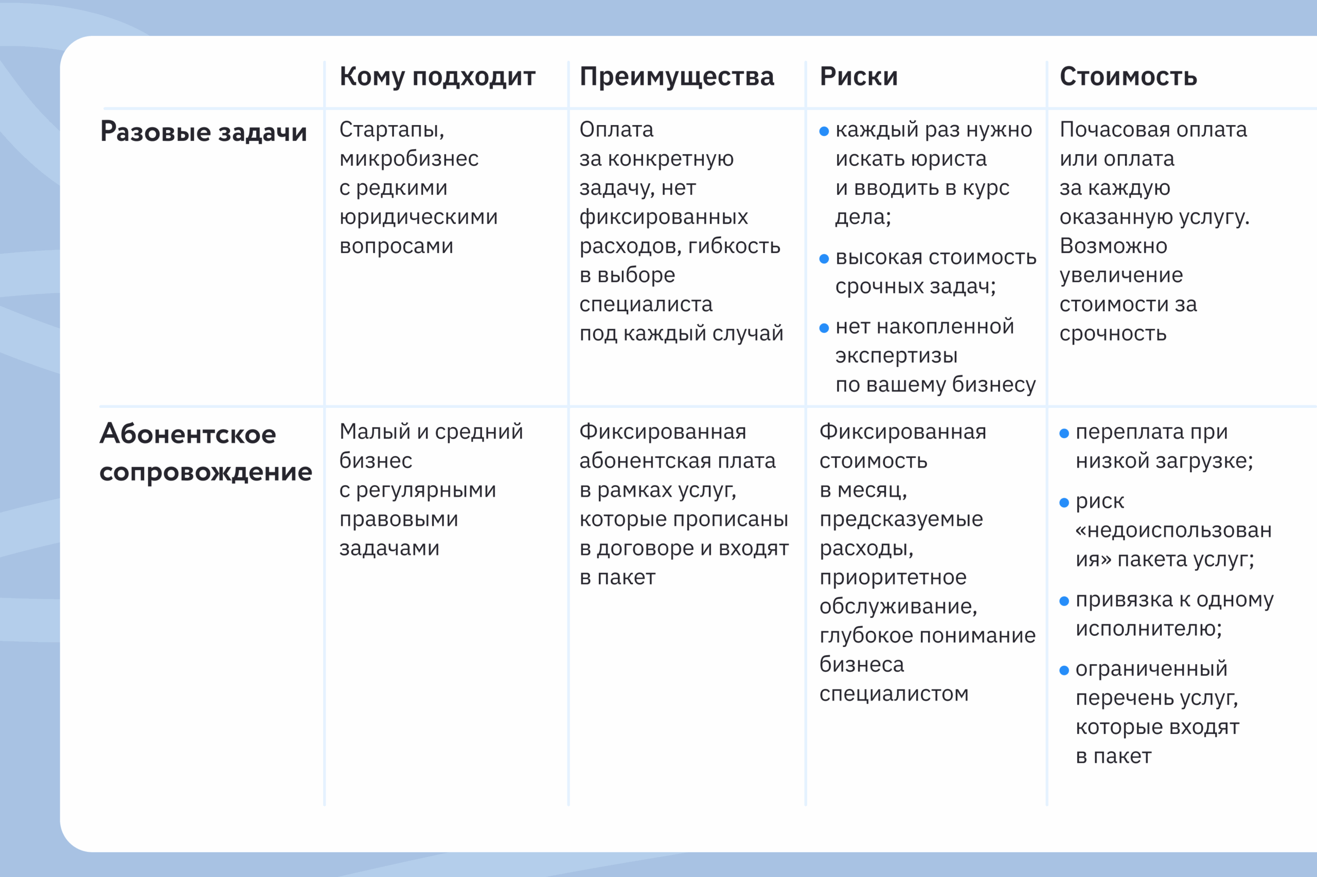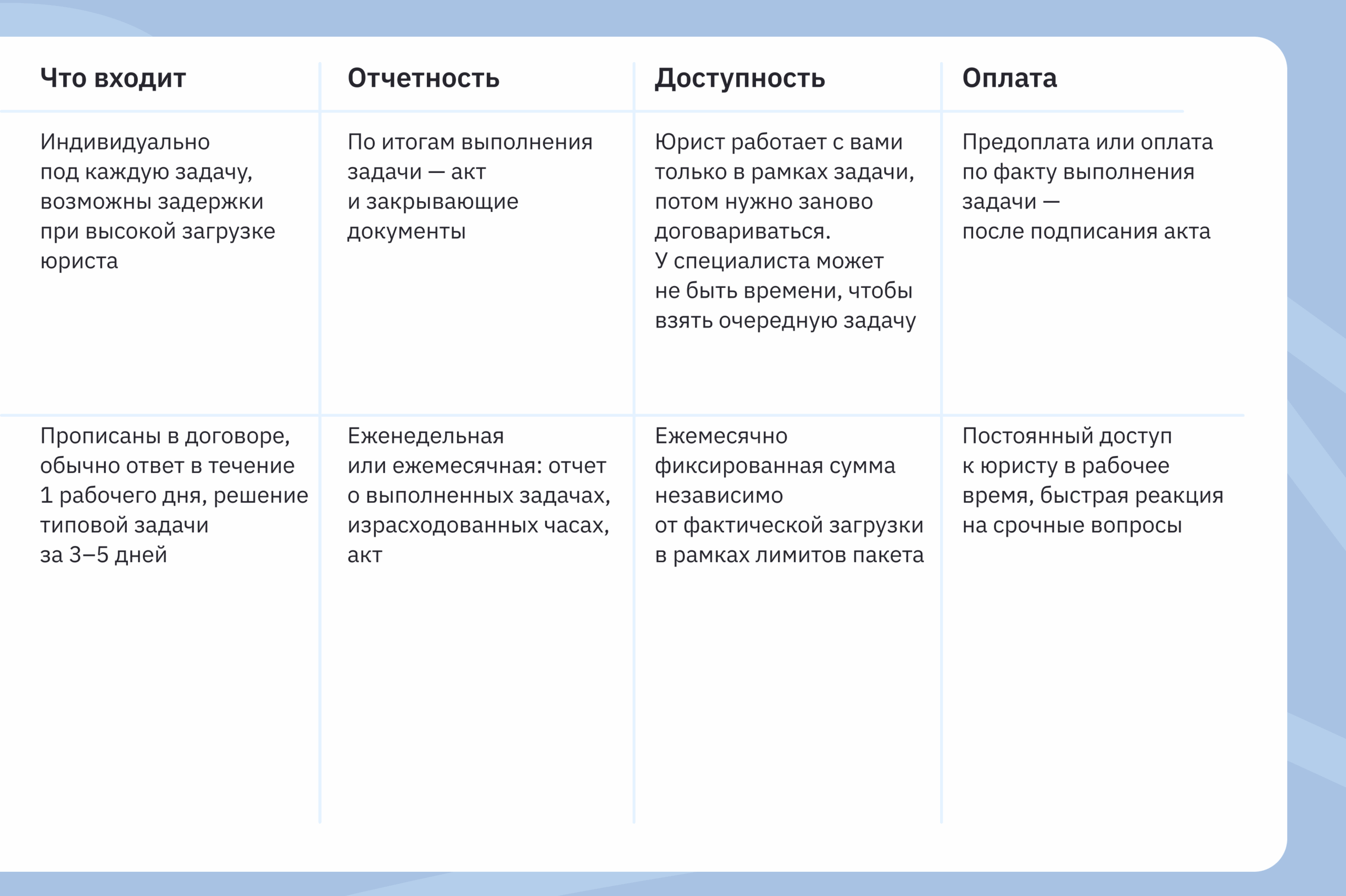 При внешнем сопровождении легко потерять прозрачность — непонятно, сколько платить, что входит в стоимость, и когда специалист предоставит результат. Плюс, если юрист самозанятый, а количество задач растет — налоговая может признать отношения трудовыми. Чтобы минимизировать риски и контролировать процессы сотрудничества, пропишите в договоре: